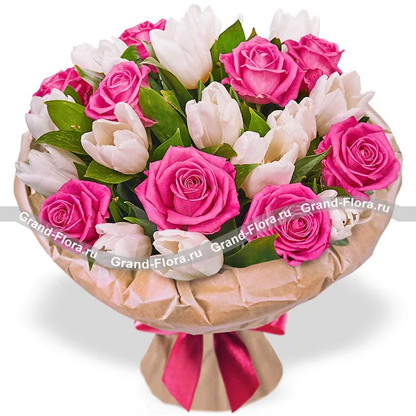 Стандартный (на фото): розовые розы - 9 шт., тюльпаны белые - 14 шт., рускус., крафт, лента розовая.